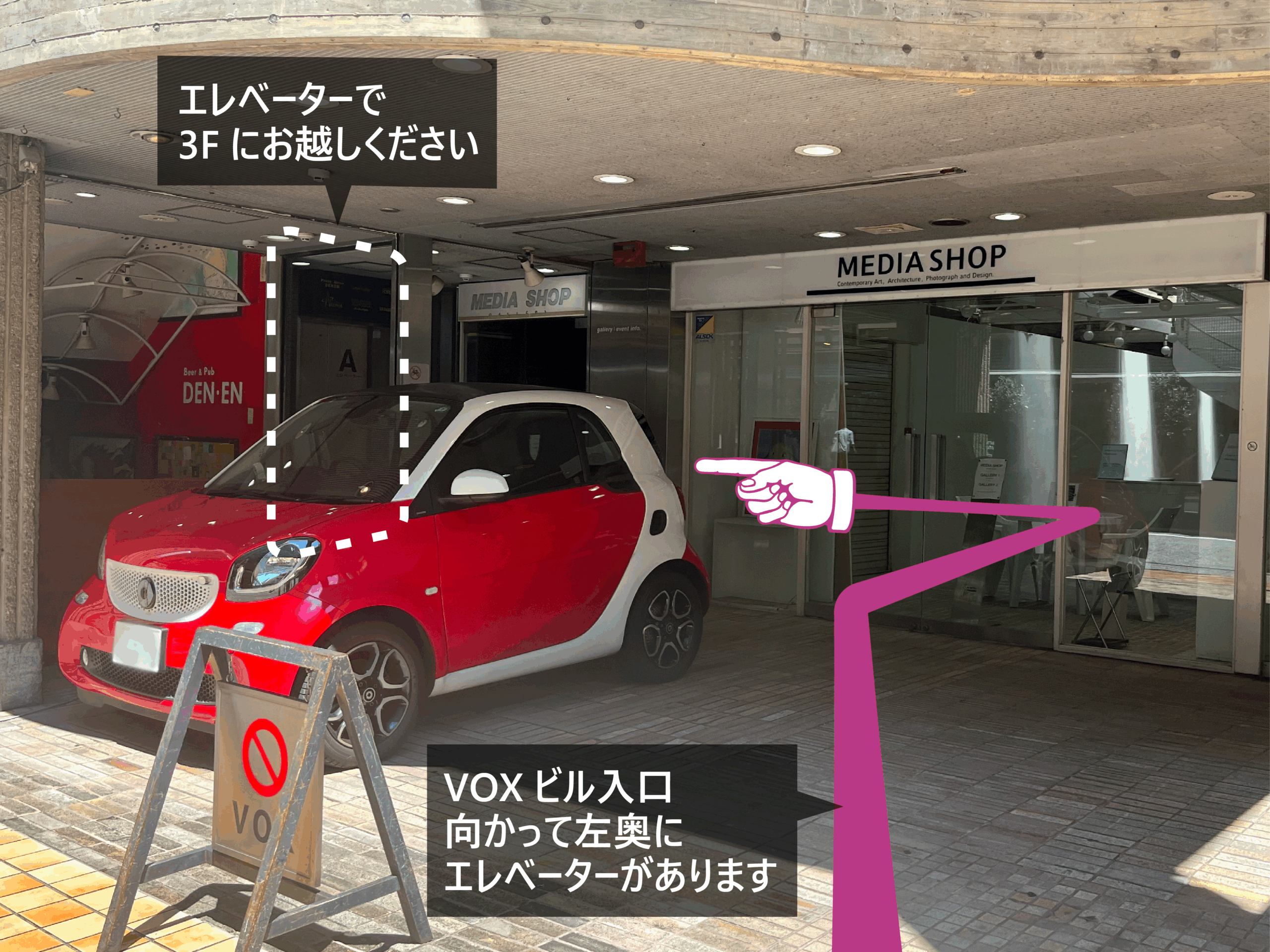 MEDIA SHOP前(建物に向かって左側)の階段またはエレベーターにて、3階「FRAME in VOX」までお上がりください。